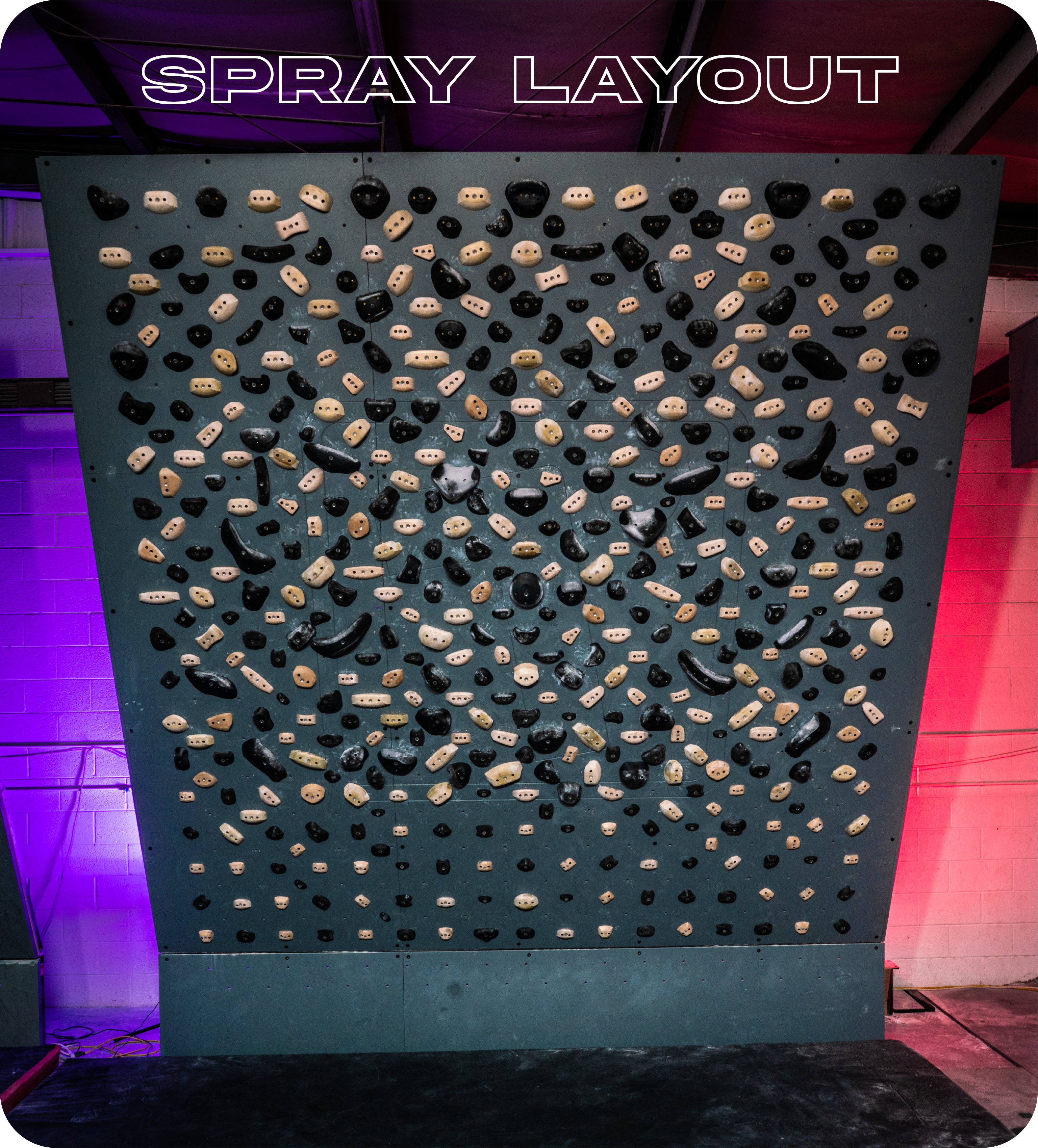 The Spray Layout lets climbers of all levels create complex sequences far more unique than typical "board style" movement due to its high quantity and diversity of holds. It also provides a greater ability to replicate sequences for practicing indoor or outdoor projects.