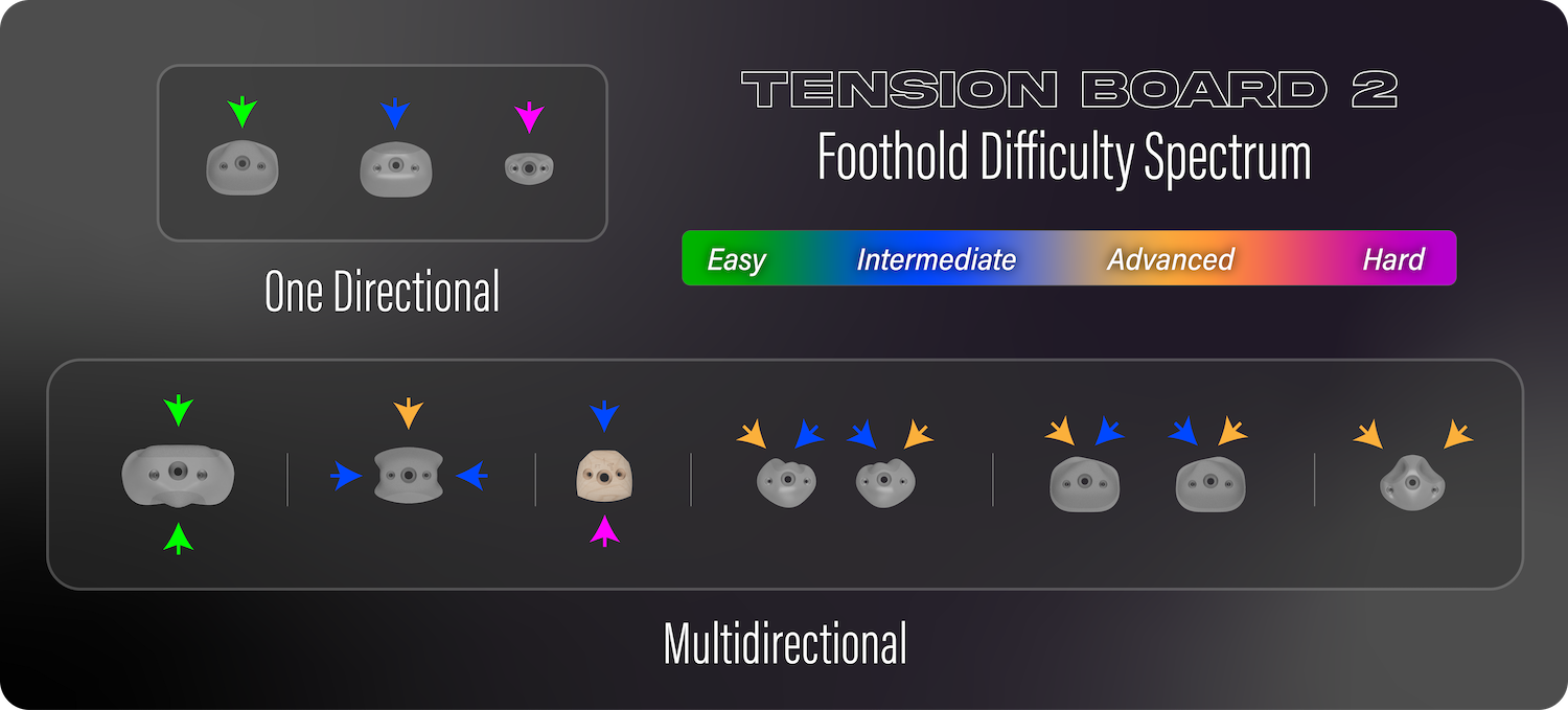 The TB2 is equipped with 11 different foothold shapes, eight of which have a dual nature depending on the climber's approach angle, resulting in a total of 20 distinct foothold experiences on the board.