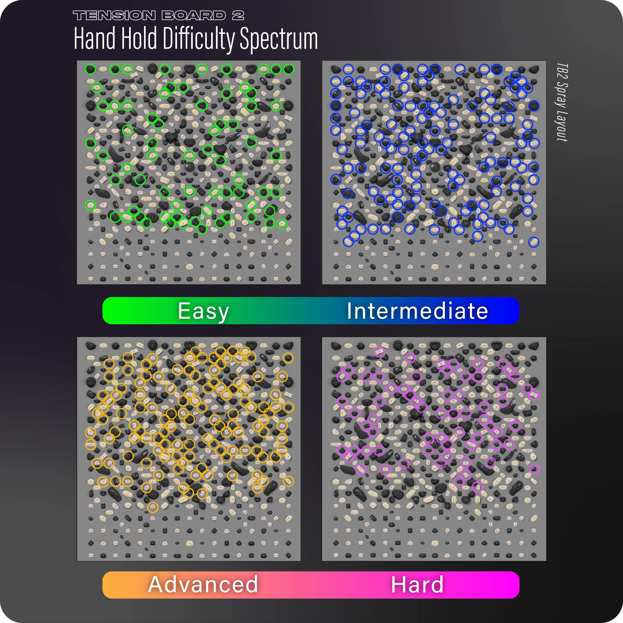 The TB2 Spray Layout offers more extreme hold orientations than that of the Mirror Layout, creating a more realistic outdoor feeling than any other standardized board on the market.